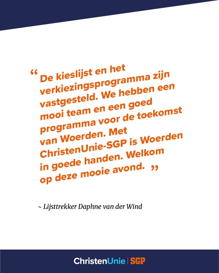 Lijsttrekker Daphne van der Wind: “De kieslijst en het verkiezingsprogramma is vastgesteld. We hebben een mooi team en een goed programma voor de toekomst van Woerden. Met ChristenUnie-SGP is Woerden in goede handen. Welkom op deze mooie avond.“